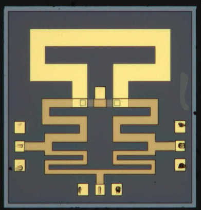 5. Doherty功率放大器芯片,主要技术特征是通过设计复杂的匹配网络,实现功率放大器的宽带响应,工作频段为4.4-5 GHz,效率为34%,退回6 dB效率大于30%。