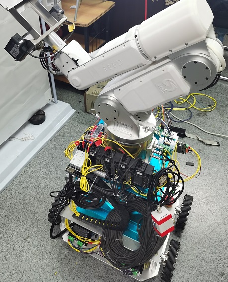 实验室早期开发的简易复合机器人,具有10个自由度,采用锂离子动力电池驱动,可以结合3D激光传感器、机器视觉等实现技术方案的快速原型,整体体积小巧,便于在实验室里调试和测试。