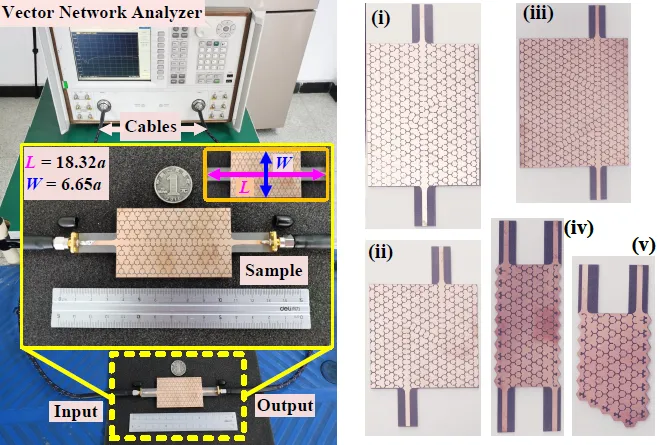 图5 多模传输基片集成拓扑光子晶体波导加工样品及测试场景