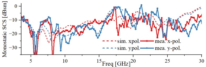 在辐射性能方面,具有垂直电耦合特性的宽带偶极子单元被加载到阶梯地面上,通过金属连接结构实现不同高度单元之间的耦合,使得该阵列在X波段(8~12 GHz)内电压驻波比低于2.8。阶梯地面使得阵元集体向中心倾斜,因而可支持± 45°波束扫描。散射测试表明,该17 × 8阵列在x/y极化入射波下的平均散射截面分别降低19.4 dB与18.9 dB,带内平均降低超过15 dB。